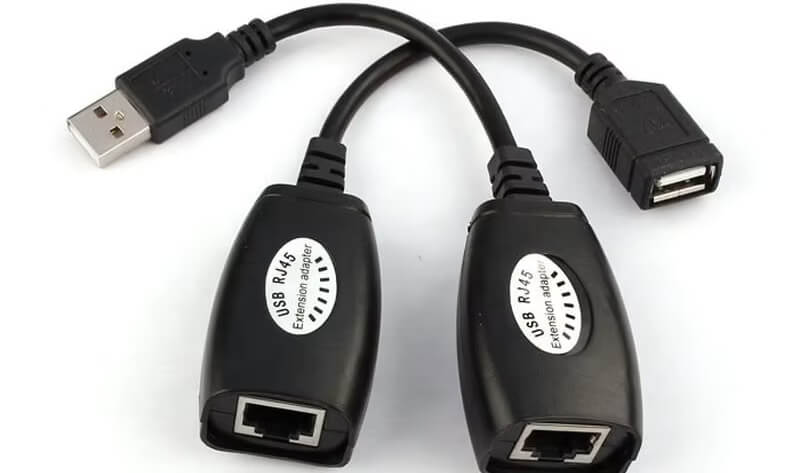 - En el otro extremo, el adaptador RJ45 a USB hembra reconvierte la señal a USB.